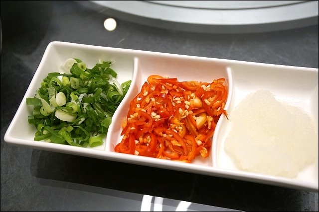 醬料有蘋果醋醬及蔥花、辣椒及蘿蔔泥,我個人喜歡加多一點蘿蔔泥,很多汁又清爽,不過有些海鮮完全不用加醬就很美味了,醬料只是提味用。