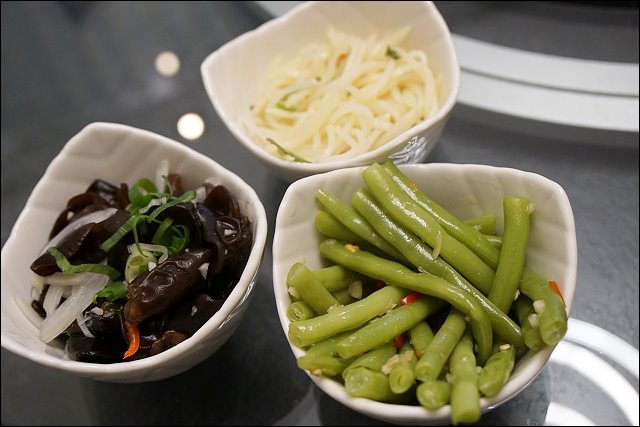 招待的餐前小菜,四人用餐的話直接上三份,用餐當天的小菜是涼拌四季豆、黑木耳等,口味清爽還滿開胃的,若是二人用餐則是二盤,不過小菜可以免費續盤,喜歡可以請店家再補。