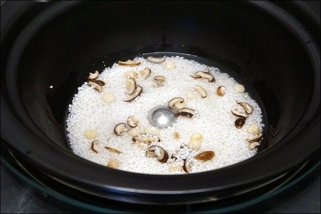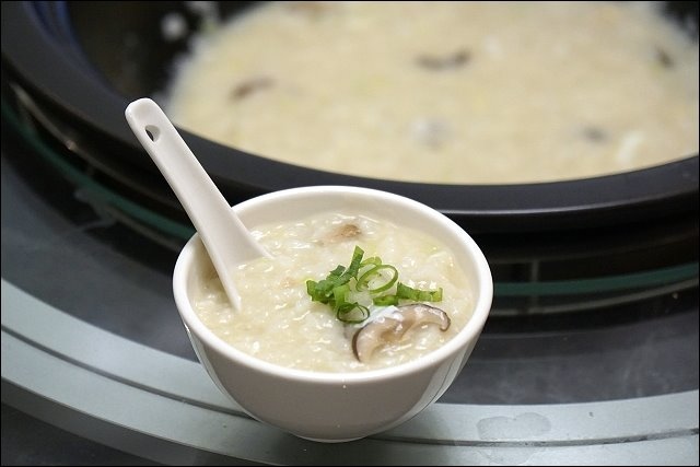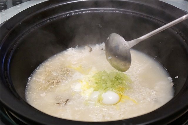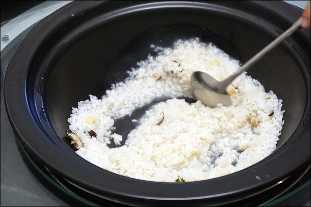 偶爾要翻攪一下鍋底的粥,避免蒸氣不均讓米粒熟度不均,感覺海鮮粥慢慢的吸飽海鮮的湯汁,好期待。