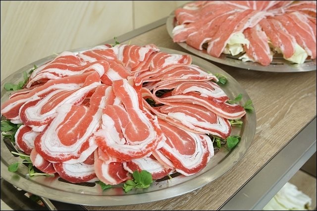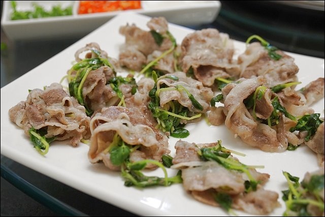 海鮮連吃好幾樣,接下來換個口味,牛五花底下舖著小豆苗,這裡的食材料理全都由服務人員服務,從下鍋到盛盤,全都有桌邊服務,不但食材好,也不用怕蒸時間太久而過熟,我們只要等著吃就好(根本就是貴賓等級!),連牛肉都幫我們一片一片捲好青菜裝盤,服務實在很周到!這五花牛還真好吃,沒加加油去煎,利用牛五花本身的油脂,清蒸出它原始的肉汁,肉有嫩,重口味的朋友可以沾點店家的特製醬汁提味。