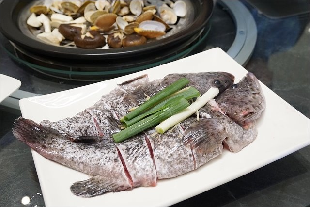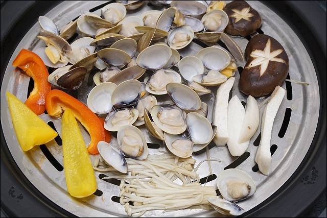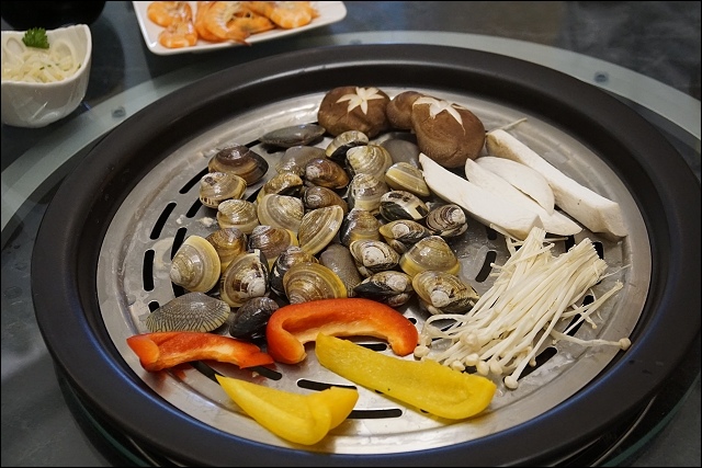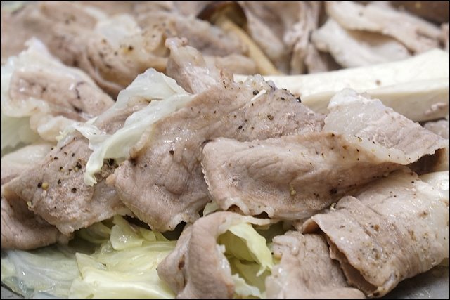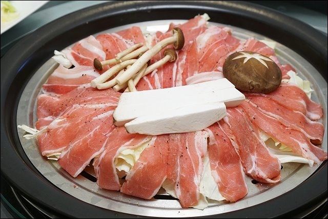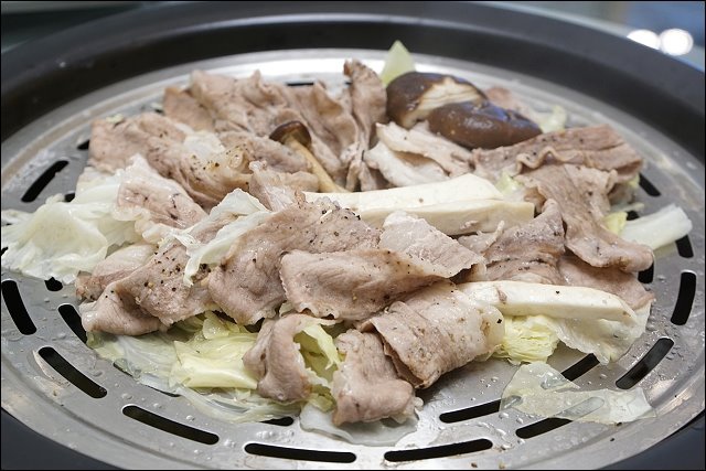 嚴選五花豬,下面舖滿高麗菜,豬肉有撒些胡椒塩提味,不過可能我說我很愛胡椒,胡椒下手重了點,豬肉跟牛肉口感差很多,五花牛是軟嫩帶油,豬肉則是紮實Q彈,看你是愛吃豬還是愛吃牛都行,對了,若是不吃牛的朋友,可以二盤都點豬肉,若是像我愛吃牛,也可以二盤都上牛!吃到這裡堪稱海陸全餐全都下肚了,我們一行四個人已經有飽足感了。