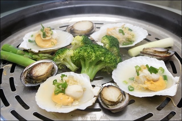 我在拍照時四顆九孔還在扭來扭去邊跳舞,新鮮度真的沒話說,好鮮甜,口感也很好;扇貝已經有事先加上蒜末調好味,蒸好的時候滿滿的湯汁,真好喝,花椰菜都被我家姪子掃光,他說好清爽好甜,完全都沒想到要留一朵給我@@