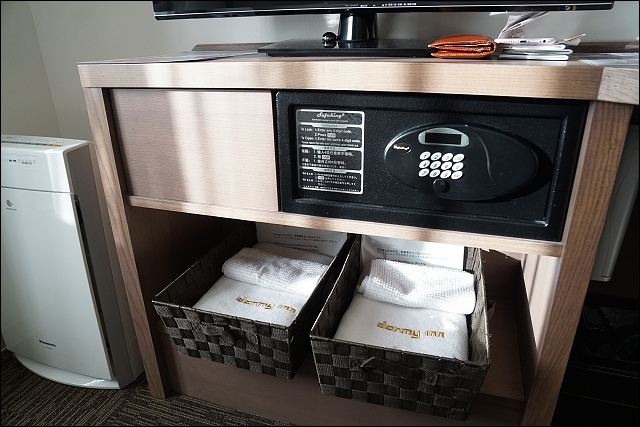 電視下方是保險箱及毛巾盒,最旁邊是加溼空氣清淨機。