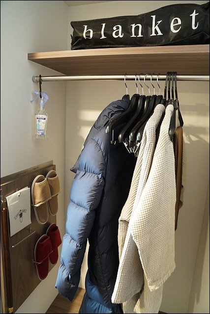 開放式衣櫃,上頭還有一件備用毛毯,浴衣褲都吊在這裡,旁邉也有室內拖鞋可穿,下方有做一層隔板,步鞋可放下面,登機箱可放上面。