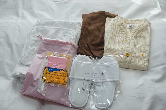 辦好入住手續,櫃台給了我基本的二張房卡,還有溫泉的密碼券,這裡有免費大浴場可以泡湯,女湯天天換密碼,另外還給我一份小孩子的盥洗包,裡頭有一套兒童睡衣、拖鞋、牙刷、洗澡海棉及毛巾。