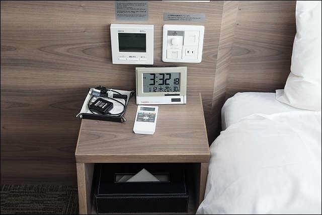 床頭小櫃,房內的燈、空調都在這控制,備有多種轉接頭的電線及抽取式衛生紙,對了,旁邊還有一張靠背椅,我把它搬去書桌,加上書桌的椅子,剛好可以坐二個人。