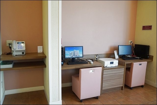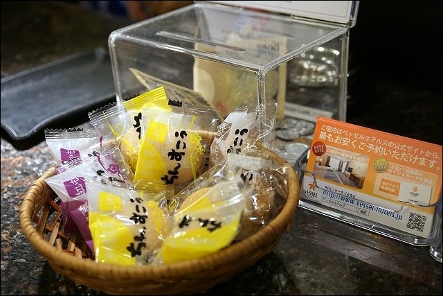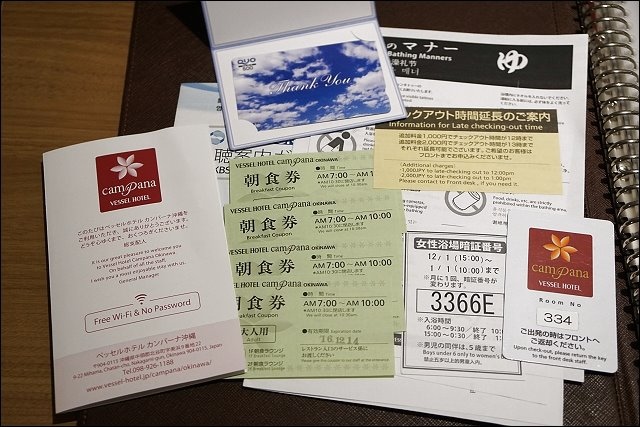 連續入住可以選擇不需打掃的服務,可以省五百日幣,飯店會給一張購物卡,超市也能使用(但我不知丟哪了@@),櫃台前也有沖繩土產小零食可以吃,check in完成,櫃台會給二張房卡、早餐券及大浴場密碼。