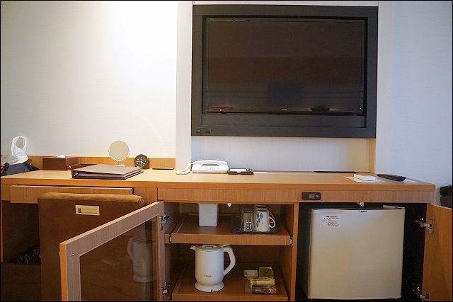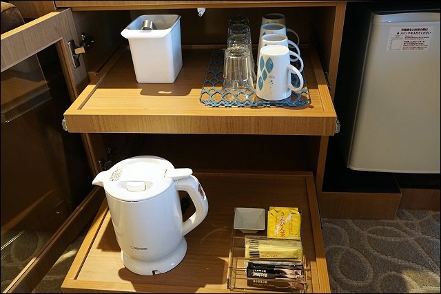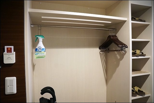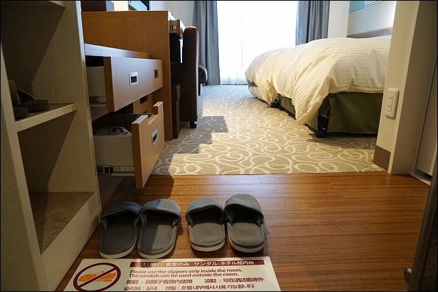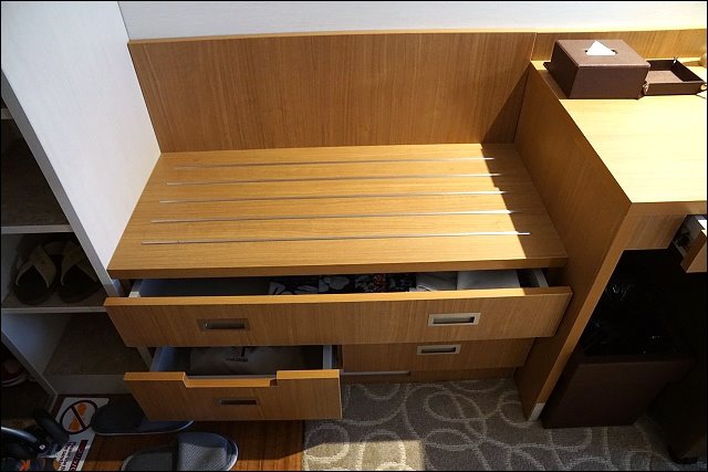旁邊有鞋櫃,涼鞋可以穿出房門,去大浴場泡湯穿這就好,旁邊有矮櫃,不喜歡把行李箱放地上的朋友,這裡放行箱不用彎腰或蹲在地上拿東西,很方便。