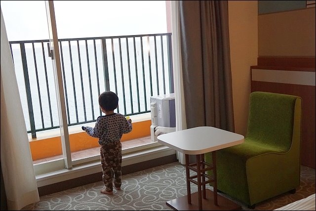 床旁邊還有大空間,靠牆沙發座阿弟都可以躺著玩,另外還有一個小茶几跟椅子,整片落地窗看出去就是海景。