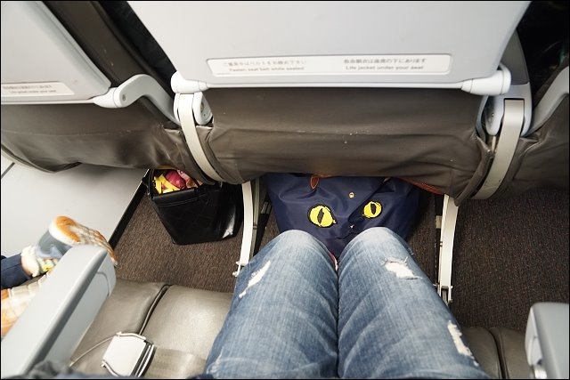 第一排前面空間最大,可惜帶小孩就算有錢也不能坐這裡,因為第一排跟逃生口的座位是需要年滿15歲以上,發生緊急事故需要提供協助。我坐14排標準座位,隨身包包放在前面座位下方,我的腳的空間還滿夠的,若是手長腳長或size比較大的朋友,建議可以加價選加長座位空間,坐起來一定更舒適,不過其實飛日本才三個小時,睡一下就到了,這筆我都省起來!