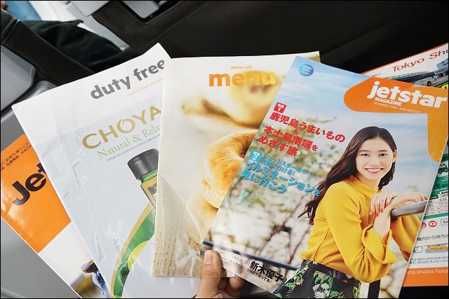 機上雜誌、免稅品型錄、餐點Menu通通放在前面座位的椅背上,是設計在前方椅背的上方,方便拿取,不過因為是一體成型,不是設計網子,沒辦法放保溫杯是我覺得不太方便的地方。