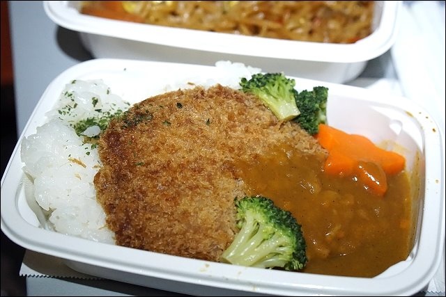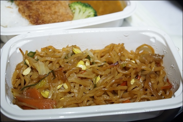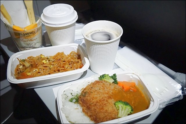 機上餐事前預訂豬排咖哩飯跟炒麵,熱度很夠,炒麵還行,微波的炸豬排外皮可惜不酥了啦><",不過咖哩配飯很順口就是,套餐含咖啡、紅茶或綠茶一杯。