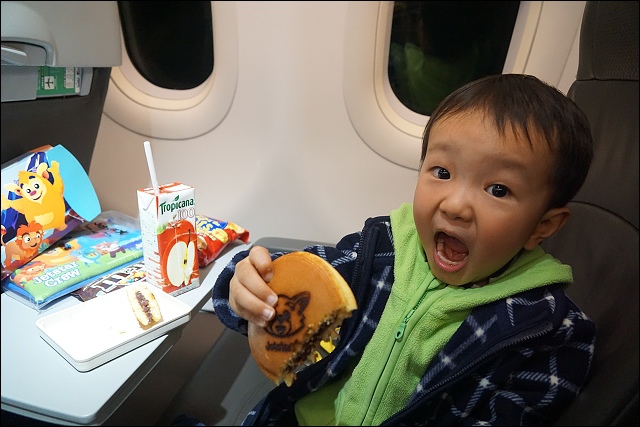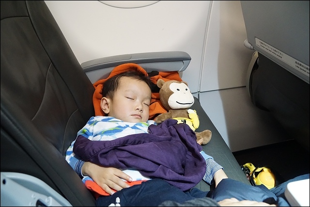 弟弟果然上機沒多久就進入夢鄉,他睡覺必備的小被被跟小猴子都得陪著他才行,就差忘了幫他載口罩,口罩我竟然放在行李箱@@,機上高空中比較乾,建議大家可以帶口罩保護鼻子跟嘴巴。
