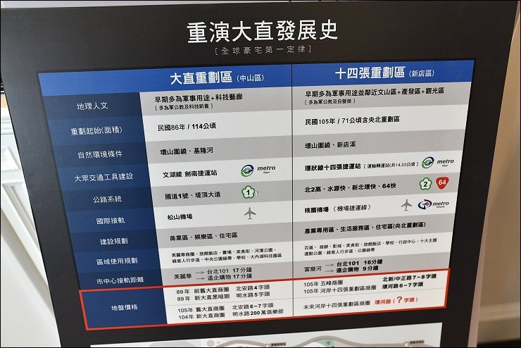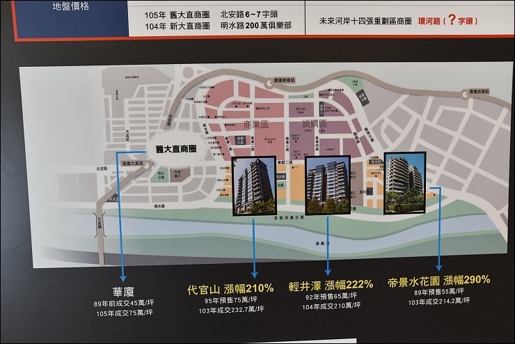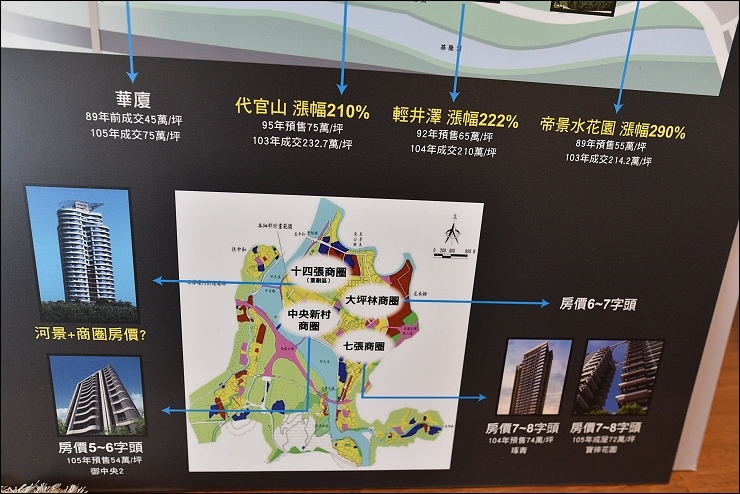 接下來正式開始看房啦!先聽聽銷售人員的介紹:「水岸住宅的天王級價值,在美國財經雜誌Forbes與Ultimate Home兩大國際級指標刊物均有報導,水岸第一排的身價更是非水岸2~3倍以上,價位屢屢飆升,像是大直水岸區指標豪宅一度翻漲到每坪214萬元,仍然吸引名流爭相入住,而離敦南只要8分鐘車程的新店富裔河,正是以大直水岸為指標重劃,將大直水岸價值完整複製,在新店重現大直風華,合理價位坐擁水岸豪宅,坐落十四張重劃區後勢看漲!」大直水岸區一坪破二百萬,而現在的新店水岸房價還在六字頭,口袋比較深的朋友,想也知道那裡才是潛力股,等捷運環狀線開通後又成搶手貨。