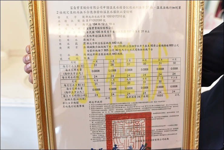 這裡的養生溫泉是合法開挖,24小時源源不絕。其他標榜家家戶戶使用溫泉水的水岸住宅相較,很多都是由他處運送溫泉水,但「富裔河」建案取得合法施工許可,1650米深度基地深挖鑿井取得溫泉水,並獲認證水權狀,24小時不間斷供應住戶使用。銷售經理說:這裡的水岸豪宅講究身心放鬆與滿足,希望為住戶打造一座「心靈帝堡」,因應現在的多房趨勢,很多富豪會將「自住」與「渡假」分開居住,不管是宴客、聚會、渡假,都是「富裔河」擁有的多重功能,得以專心享受身心靈饗宴,獲得最大的抒壓、放鬆效果。