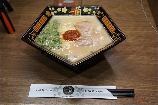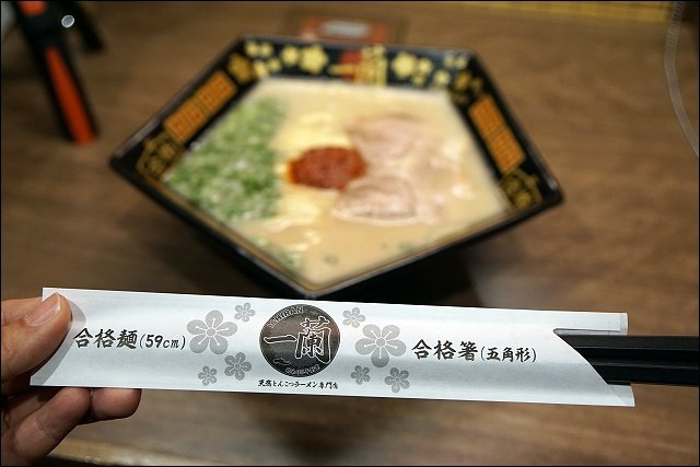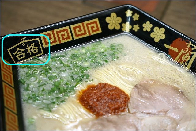 台灣考生都會去拜文昌君,而日本很多人為了求考試及格或是工作順遂等等,會來到祭祀學問之神菅原道真的太宰府天滿宮祈求考試合格,所以一蘭拉麵太宰府分店就推出限定款,用五角形的碗盛拉麵。五角在日文的發音近似合格,吃了會金榜題名哦。合格套餐,有合格拉麵、半熟蛋、加麵還有一瓶解脂茶,讓考生有充分的營養,更特別的是,這份合格套餐價格是1410日圓,從食券機器投入二千日元,會找590元,59是合格的諧音,也是希望可以讓考生金榜題名。