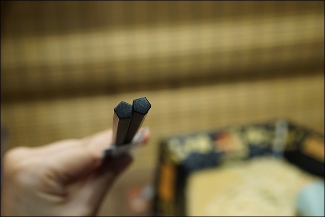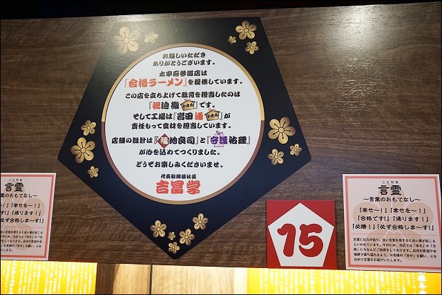進到位子上,位子上方也有太宰府限定五角合格拉麵的說明。筷子也是用五角形,合格麵的長度也比一般麵條長二倍以上,長達59公分的合格麵條 (59日文發音近似合格的發音)。
