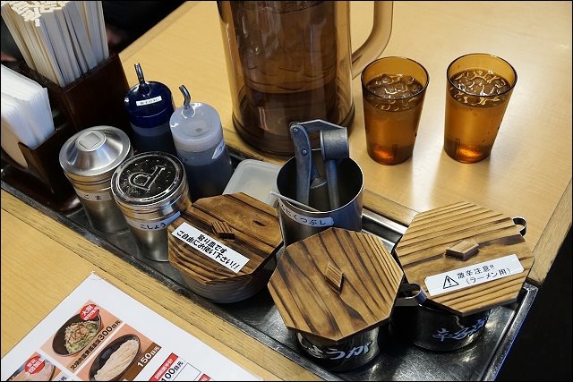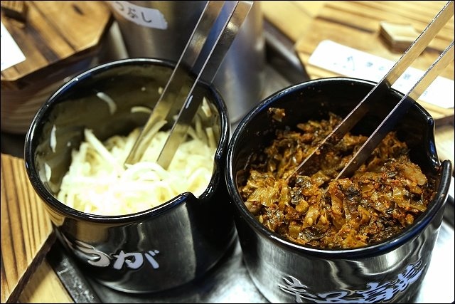 桌上有各式調味料,沾餃子的醬油、蒜頭、薑絲跟辛味高菜,薑絲不是用紅薑,味道不會很重,倒是九州特色高菜,有點像是台灣的酸菜,這家的高菜算是我吃過辣度比較高的。