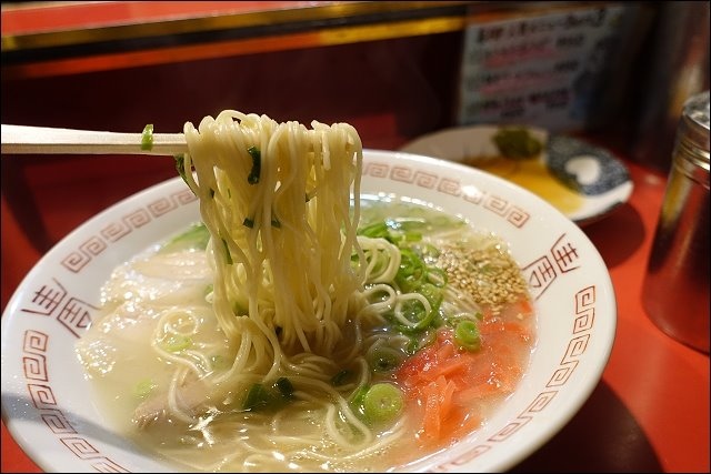 這是我第一次在屋台吃拉麵吔,麵條的軟硬度蠻剛好的,二片叉燒肉比較小片,是帶肥的五花肉,配料有紅薑絲、青蔥及芝麻,撒上芝麻後香氣大增,這裡的湯頭明顯有比較清淡一點,蠻適合台灣人的口味哦!