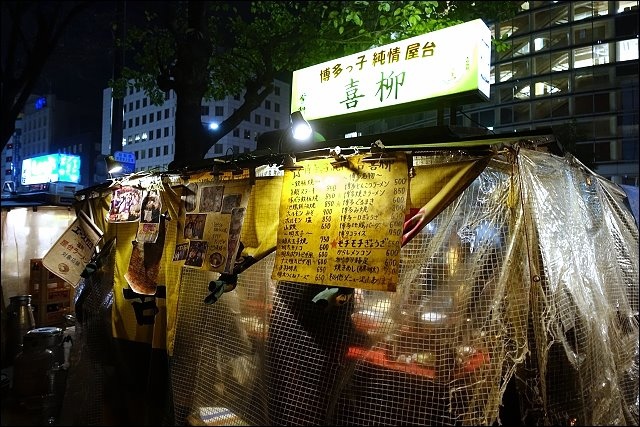 一連看了早午場的二家拉麵,晚場當然就選定博多的特色之一:屋台。日本的屋台有點像台灣的路邊攤,主要集中在福岡天神到中洲川端站這段,有賣拉麵、串燒、餃子、炒拉麵、牛雜,甚至還有和牛!!日本人下班後都會跟同事一起去吃飯喝酒,往往不是一攤就結束,開心時甚至會有第二攤、第三攤,而續攤最常被點名的就是拉麵!