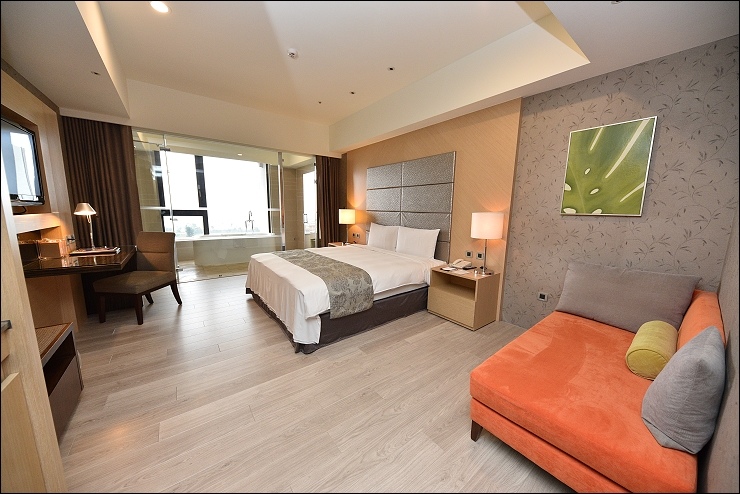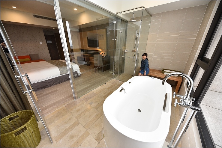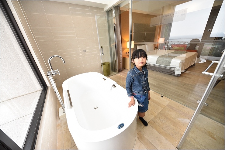 煙波飯店還有特別的尊榮客房,規劃了大坪數衛浴空間,讓房客可以在海景落地窗前的大浴缸中泡澡,不過這個房型是雙人房型,比較適合小倆口蜜月約會渡假。