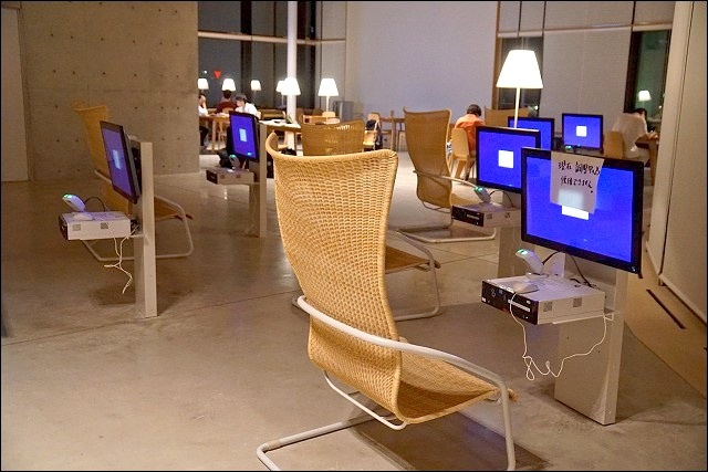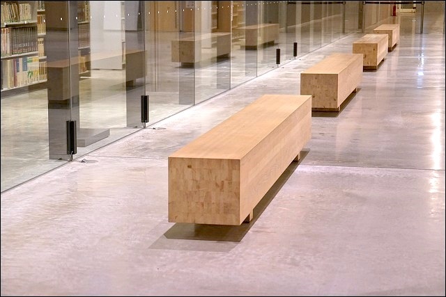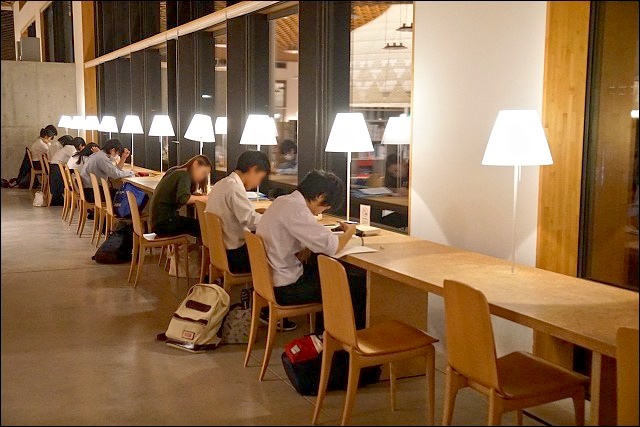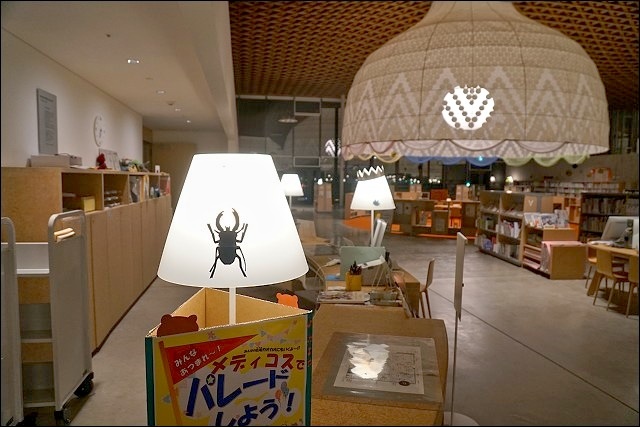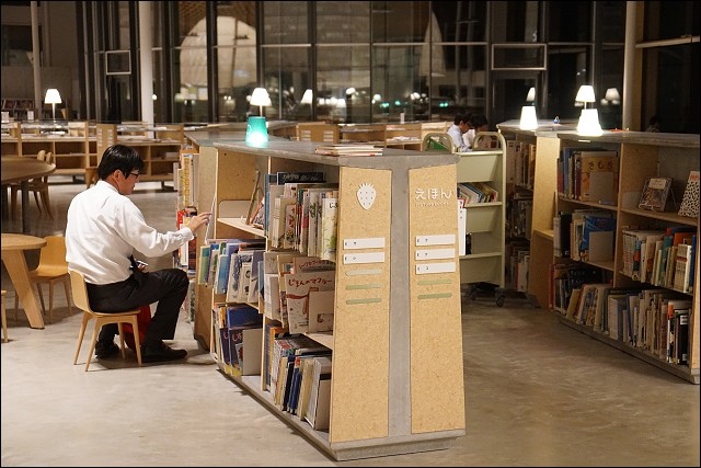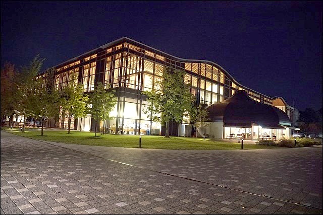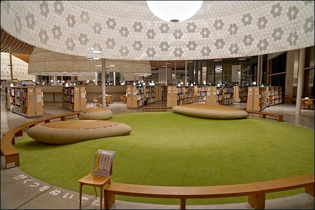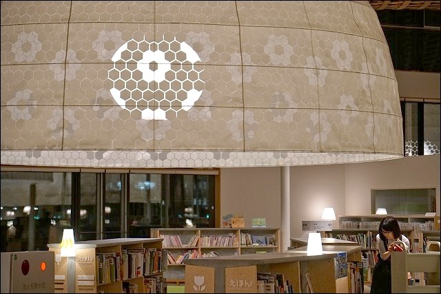 我們趁著溫泉旅館的會席料理上菜前來一探究竟,遠遠看到整座發光透亮的落地窗有嚇到!壓根沒想到這原來是座圖書館來著,也太美了吧~~就連戶外也有設置座位區,而且都是木頭製的,包括地板也是,好有質感啊~~