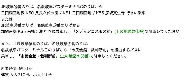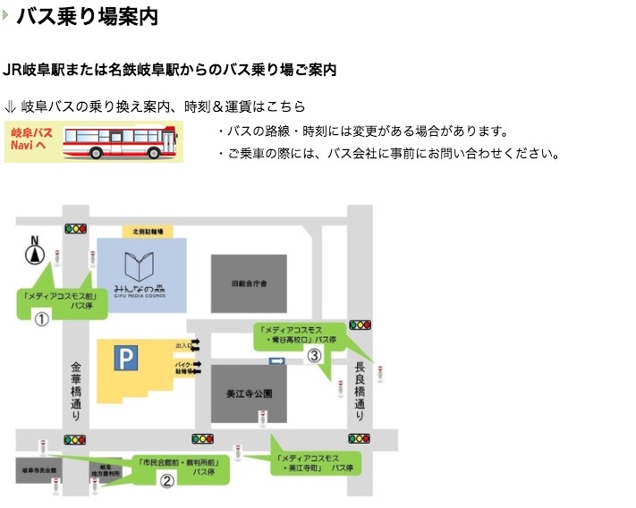 這裡離岐阜車站徒步約25分鐘的路程,建議轉乘公車比較省力(請找到10號公車月台),K35、K50、K51、K55的公車都可以坐,搭到「メディアコスモス前」站(車程10分鐘、車資210日元),另外從名古屋過來約30分鐘的車程,如果不是自駕的話,搭乘大眾交通工具也挺方便的(巴士路線取自大家的森林官網)!