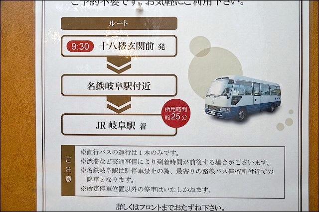 JR岐阜駅2F長良口出站,在JR岐阜駅北口巴士中心12、13號乘車處搭乘岐阜巴士往高富、三田洞団地、松籟団地方向的公車,在長良橋站下車,再徒歩2分鐘即到