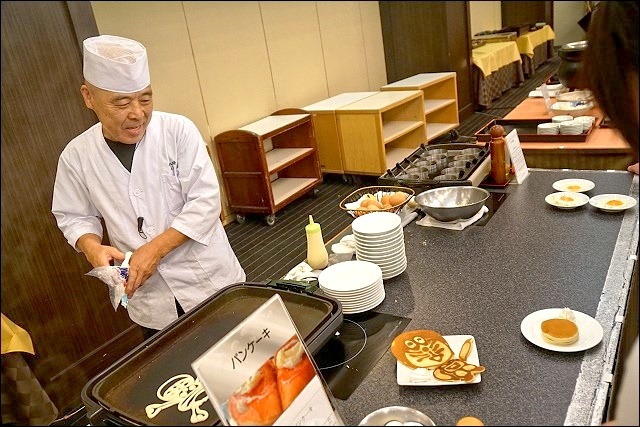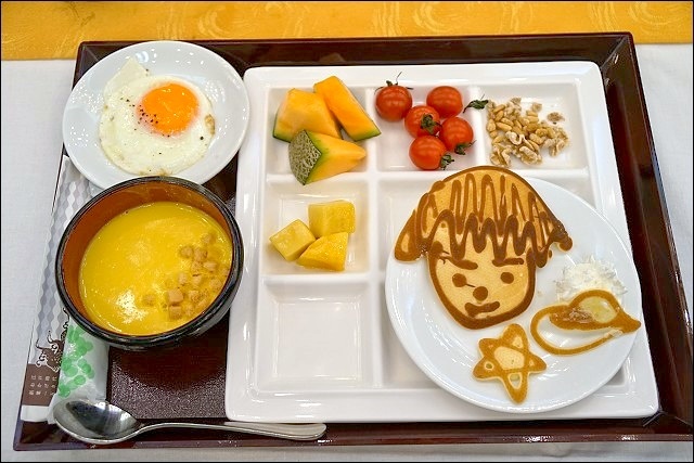 這裡的早餐賣點是這位笑臉盈盈的阿伯,他的鬆餅千變萬化,只要你喊的出來他都可以做出來,超強的!這是我的小王子大集合,還有星星跟宇宙一起,阿伯真的很有概念欸!我的早餐一向以水果跟生菜為主,這天還多了堅果、荷包蛋跟玉米濃湯。