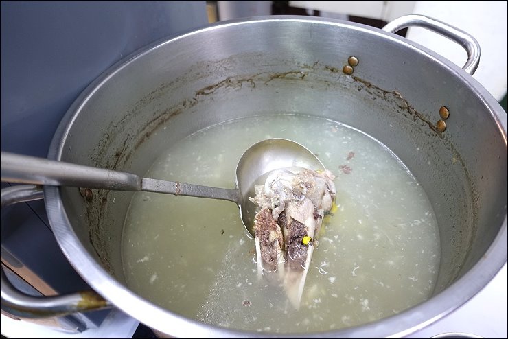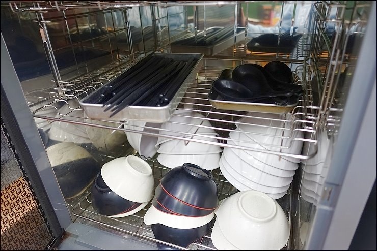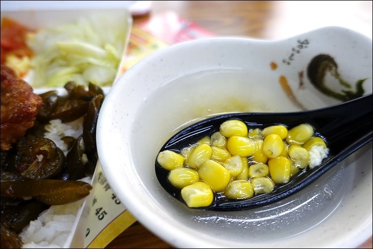 內用筷子、湯匙、小碗都放在烘碗機裡,湯自取,大骨湯加了不少玉米粒。