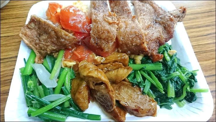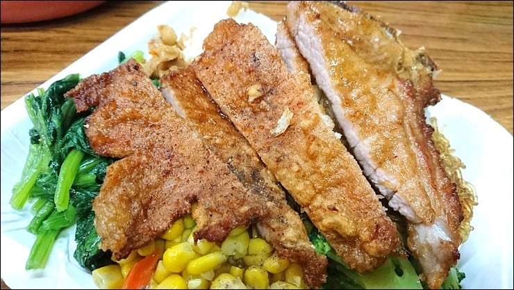 特製炸排骨飯80元(單點炸豬排45元),現點現炸的特製排骨需等上幾分鐘,內用會用免洗紙盤盛裝,先點四樣小菜再等主菜炸好才能拿到。看這特製炸排骨份量很大,都快看不到配菜啦。秦記排骨店家標榜是用當日溫體豬肉,再用醬料去醃,肉質的確吃起來沒有豬腥味,肉新鮮口感又好,而且,它不像有些便當店裹超多粉,只有用薄薄的麵皮粉下去炸,不會吸附過多的油在肉上。