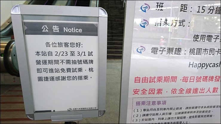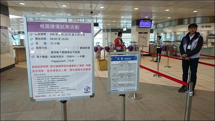 桃園機場捷運的公告:「2月16日至3月1日,為民眾自由試乘,每日搭乘時間為上午8時至下午4時,夜間則進行設備系統保養改善等工作。自由試乘的民眾無需預約,只要至機捷全線21個車站,現場排隊抽取當日試乘號碼牌,即可免費進出各站自由搭乘,而且直達車和普通車皆可試乘。試乘期間各站發放號碼牌的時間為每日7:40、9:40、11:40、13:40四個時段,每日總人數控管約2萬人、4萬人次搭乘,但將依各站進出人數彈性分配調整,6歲以下孩童免票證、6歲以上一人限領1張。 自由試乘期間民眾搭乘流程為 一、各站現場排隊,二、領取號碼牌入站,三、蓋手章自由進出。以站體最大的A1台北站來說,自由試乘每時段約發放1200張號碼牌,發放位置分為兩處(圖1黃色標),主要為A1站地面層1號出口處,規劃每時段發放800張,因排隊可容納人數空間較大,考量民眾安全與舒適度A1站1號出口設定為主要發放排隊區;第二個點為連接北車之B1連通層(站內藝術-竹林流水前),規劃每時段只發放400張,因連通道前有階梯上下並且排隊空間相當侷限,以安全秩序顧慮規劃只容納400人,並列為次要排隊區,超出人數即鼓勵引導民眾往1號出口主排隊區領號。民眾排隊領取號碼牌後,將於進站時回收號碼牌(圖1藍色標)、出站時蓋手戳章(圖1綠色標)。民眾進站後可自由搭乘普通車或直達車,出站後也可憑手戳章再自由進站。另外,於A1站辦理預辦登機的出境旅客(圖1紫色標),並不需要再排隊領取號碼牌,民眾在完成預辦登機手續後,工作人員將發放機捷搭乘券,確保預辦登機後將出境的旅客皆能進站搭乘。」
