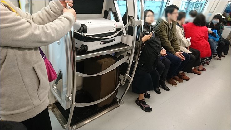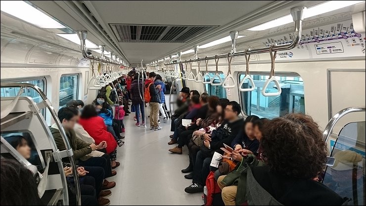 大約十點上機場捷運,座位全滿但車廂應該不到五成滿,但中午過後回程全車大爆滿(只能用架恐佈來形容了~~),還碰到老人和孕婦娃娃車大吵架,感覺大家擠到火氣都上來了。