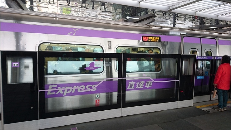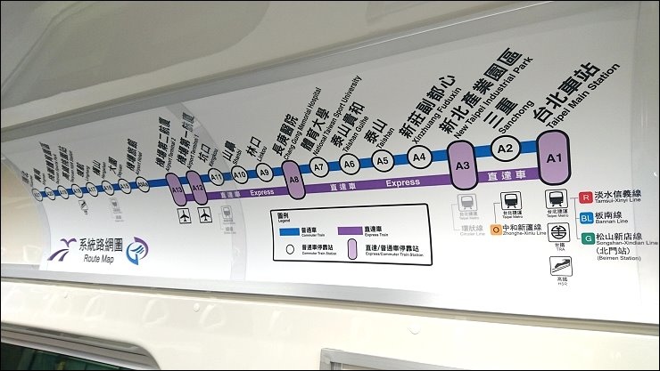 到了A8長庚站總算見到機場捷運直達車的車廂啦!站站停的普通車車廂是藍色,而直達車的車廂是紫色,只停A1台北車站、A3新北產業園區站、A8長庚醫院站、A12機場捷運第一航廈和A13機場捷運第二航廈。