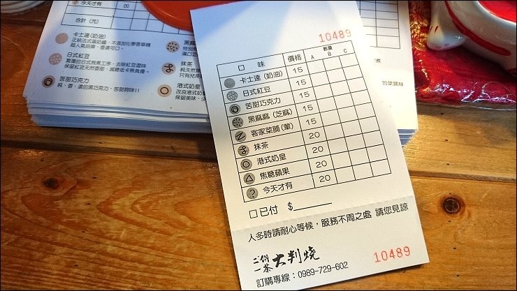 二餅一茶大判燒的口味很多,基本款奶油卡士達、日式紅豆、苦甜巧克力、黑芝麻、客家菜脯、抹茶、港式奶皇、焦糖蘋果、還有問號隱藏版今天才有的泰式椰奶,這麼多口味很難一次吃透透,基本款卡士達來三個、今天才有的泰式椰奶來二個,其他就隨意亂點吧~~