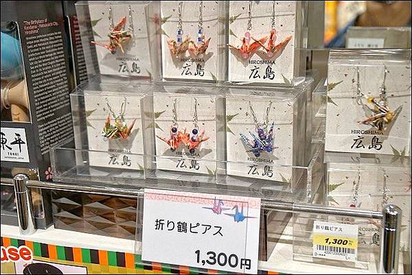 另外車站內的伴手禮街道也超好買的!這裡竟然有很難買的獺祭及他家的煎餅跟蛋糕,還有彩妝界享有盛名的熊野筆,連日本首相安倍送給美國總統的金泊櫻花酒也有!聽說這櫻花泊所需要的技術很高,全日本只有這家酒廠生產得出來,如果小心取出金泊櫻花可以永久保存,但因為酒太重,我只有買兩瓶送給好友,自己沒有留,所以也不知道好不好喝;另外現在日本很流行職人做的工藝品,所以紙鶴耳環還不便宜哩~~