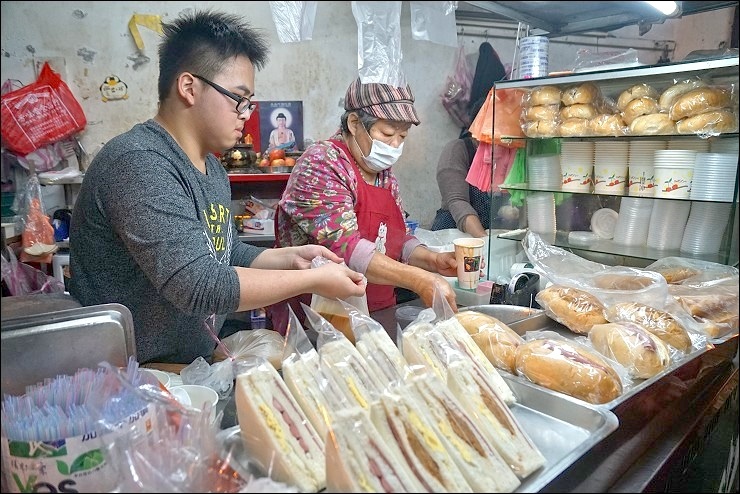 這裡賣的品項不少,基本上就是早餐店有的他都有,三明治、漢堡、飯糰、蘿蔔糕、米漿、豆漿等,另外還有沙拉船、花生湯跟鹹豆漿,看上面的價錢很平易近人。