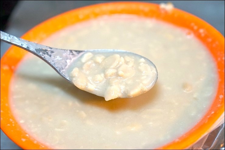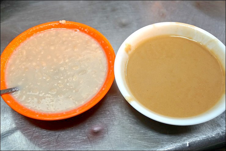 我最愛米漿,熱熱喝真的有濃好香,但一定要趁熱喝喔,溫溫的喝容易膩口,所以最不能放的就是這個!不然就是直接喝冰的,就沒這個問題!花生湯也不錯,因為便宜,花生顆粒不多(硬撈來拍照),不過花生有煮爛、湯也順口,有網友建議喝到一半可將米漿與花生湯混在一起會更讚!確實,這兩者搭在一起的味道有合,我自己平常也愛喝米漿+豆漿的混漿,可以降低米漿的甜度,又多了豆香味。看網路上的食記,夏天來好像有冰的花生湯可以買欸!