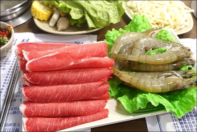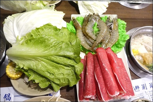 鮮蝦牛肉鍋290元,肉有雞豬牛羊可選,我愛牛啦,當然是點紅通通的牛肉啦。這盤主菜上桌我有嚇到,牛肉堆的跟金字塔一樣高,牛肉雖然油花不是很多,但吃起來確不會柴,反而肉味足還有軟,我有喜歡。蝦子有八尾,不過吃起來蝦子太彈了,有點不自然,反而是蛤蜊大勝,下回想試試別桌肥滋滋的鮮蚵。