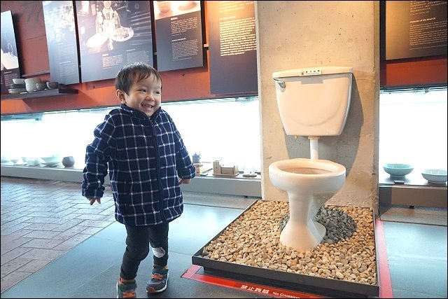剛進陶博館我還在研究從哪邊逛起,阿弟就說要尿尿,不巧又碰上一樓的洗手間在整修,只好快速上二樓廁所。先說明一下,我家阿弟現在會開口說尿尿,偶爾會太慢說來不及,所以若是長時間外出還是會給弟弟穿尿布。然後穿的尿布不是是一般大家熟悉的黏貼式尿布,而是拉拉褲。要尿尿時,尿布拉下直接就可以掏出小雞雞讓他尿尿,戒尿布階段超方便,不像之前黏貼型尿布還得撕開,尿完後再黏上很麻煩。