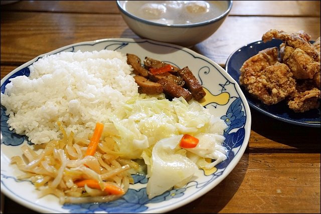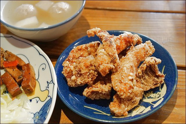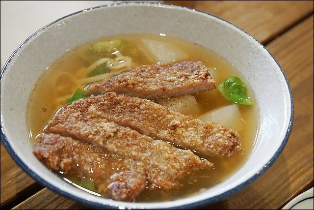 同行阿姨跟我家阿弟愛吃麵,點碗蠔油排骨麵(130元)一起吃,原以為排骨會跟湯麵分開放,但卻是排骨浸在湯裡,這樣排骨就不酥了啦,而且排骨醃的有比較鹹一點。香酥雞排飯160元,雞排切塊下去炸,有酥香,比排骨好吃。老街驛站店裡空間大,但飲料及餐點價位不低,我們才點排骨麵及雞排飯,再加一碗貢丸湯要三百多塊,價位偏高,應該不會再回訪。