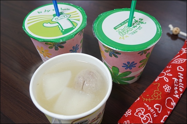 飲料跟貢丸湯很快上,貢丸湯原本只點一碗,後來一喝湯頭味道夠,直接加點一碗,蘿蔔湯有三塊和一顆貢丸,不錯吃。