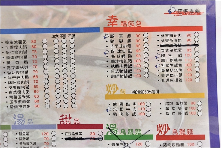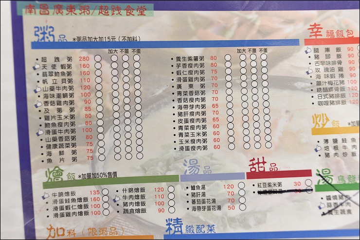 南昌廣東粥超跩食堂除了粥之外,還有便當、燴飯、炒麵、湯麵和今天主要目標超跩蛋炒飯,牆上也有經典小菜。