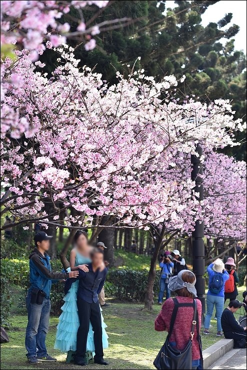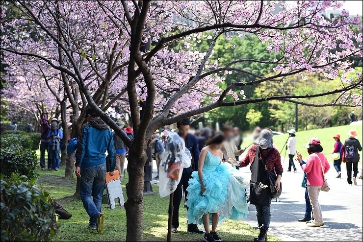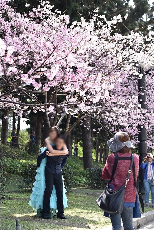 除了櫻花盛開之外,從對面婚紗街走過來拍照的新人也是全場取景的焦點。