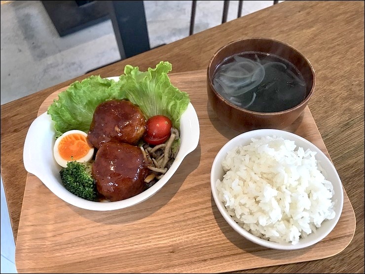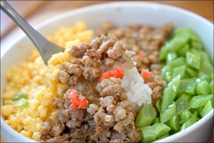從左到右,分別是蛋末、豬肉末跟蒟蒻的混合、四季豆丁,舀一湯匙混著三種一起入口,清爽的好滋味!雖然下面的白飯很好吃,但還是給太多了啦,老闆說每天菜單會盡量配成一個牛肉跟豬肉的組合,幸運的話偶爾會遇到小島三寶(牛肉、咖哩和漢堡)。