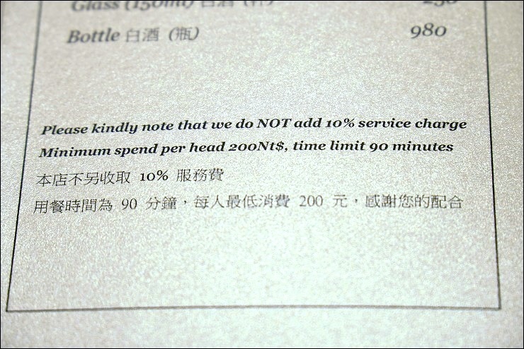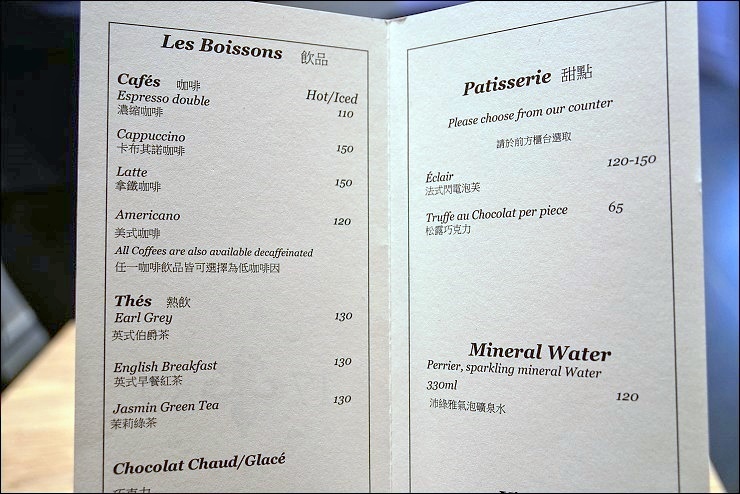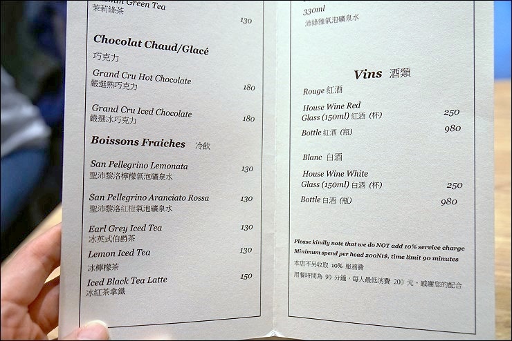 因為座位有限,有90分鐘的用餐限定,每人最低消費200元,不另收10%服務費,甜點直接去櫃台挑選,價目表主要以飲料為主,有茶、咖啡及酒類。