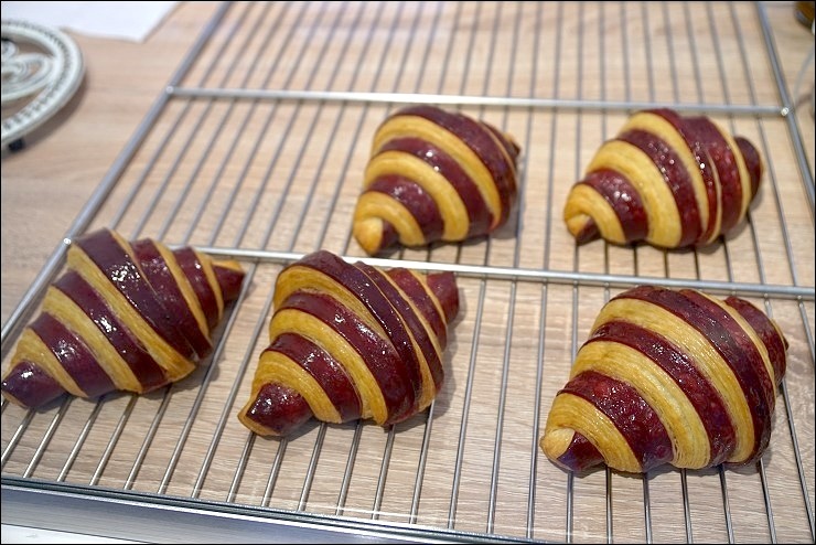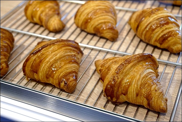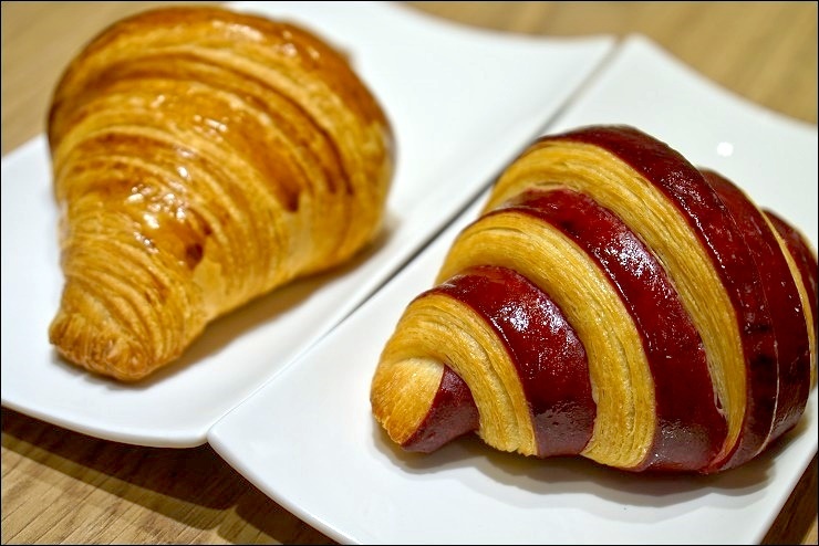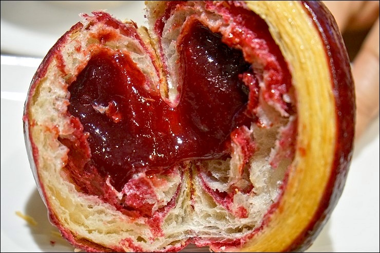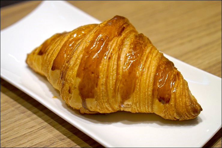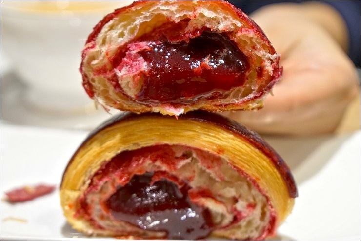 我個人對櫻桃其實沒什麼感覺,因為好吃的櫻桃很貴,平常也不怎麼常吃,結果它不止在極為酥脆的外皮裹上櫻桃色而已,剝開來裡面竟有果醬!而且還給的不少,好好吃!而且這是二店限定品項,一店還沒有哩~~原味可頌最後給朋友打包帶走當第二天的早餐,她說烤過變的比較乾,還是現吃最好吃!