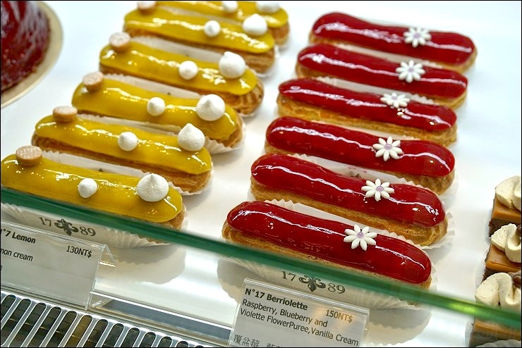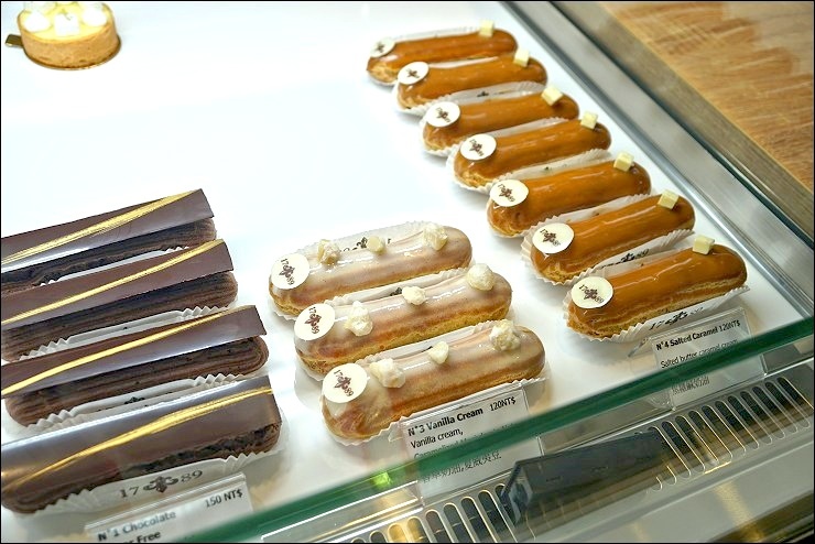 甜點櫃中陳列主要有可頌、閃電泡芙及手工巧克力等,單個閃電泡芙價格落在120~160之間,每日供應品項不一,可惜已經錯過草莓季,好想試試他們家的草莓泡芙喔。