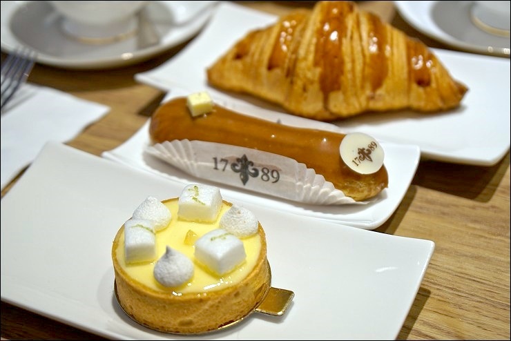 1789 Café忠孝二店才開三個多月,仁愛路一店則已經經營了三個年頭,仁愛店在捷運忠孝新生站5號出口,忠孝店則在捷運忠孝復興站1號出口,兩家店只差一站,尤其忠孝店更是位在東區激戰地帶,離sogo復興館跟忠孝館都不遠,我們吃完kitchen island中島,直接轉戰來這裡進攻甜點(完全不知道怕),整個店內分成左右兩區,一邊是甜點陳列區、一邊是座位區。