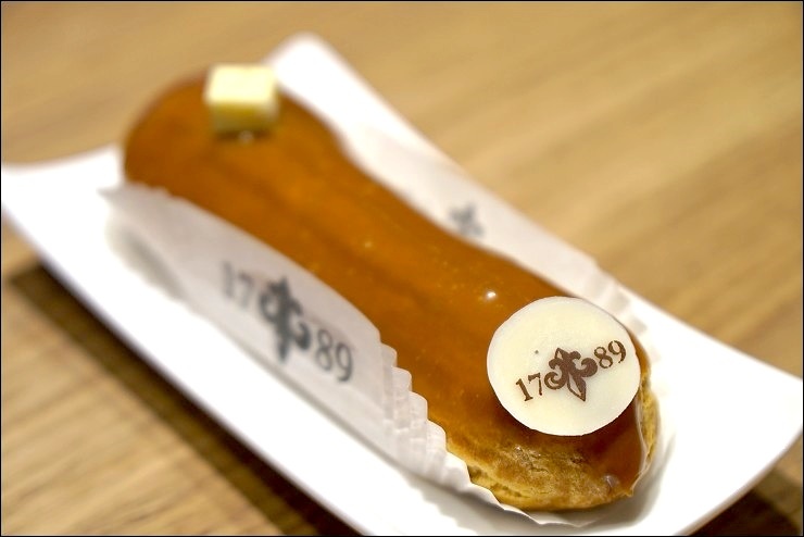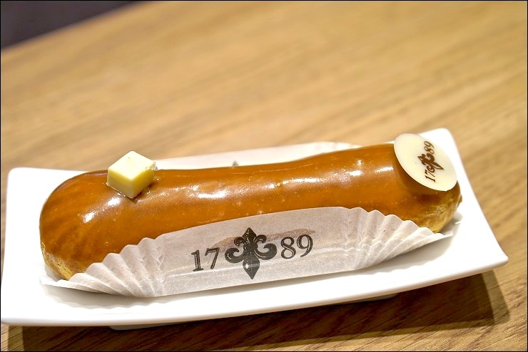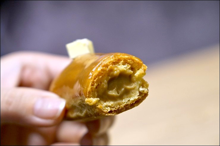 這是仁愛店連續三年人氣第一的焦糖鹹奶油/120元),之前吃過的焦糖閃電泡芙吃到後來都會膩口,但這條完全不會,或許是鹹奶油的作用,將焦糖容易產生的甜膩感降低並中和轉化,變得溫和親近,細膩又香濃。